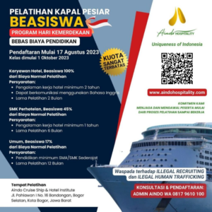 Events BEASISWA daftar JULI 2023 mulai kelas AGUSTUS 2023SIAPA BILANG KERJA DI KAPAL PESIAR SULIT? Read More » October 3, 2023 No Comments